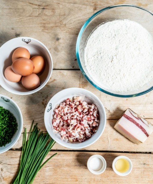 Die 150g Bauchspeck klo wirfln und in ar großn Schissl mitn Mehl, Goggilar, Schnittle, Solz und El mischn. Die Masse zi an eher festn Tog rihrn, wennar zi fest isch, konn man awie Milch ödr Wossr zuieriehrn.